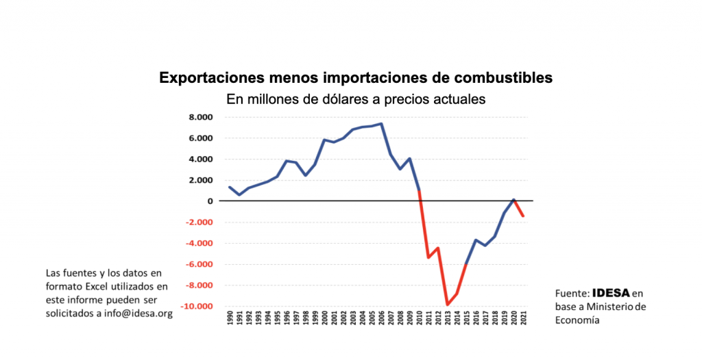 Estos datos muestran que la Argentina tiene condiciones para ser un país exportador neto de combustibles. Cuando aplicó políticas mínimamente racionales logró producir combustibles por encima de lo que consume. En el período 1991 – 2001 había contratos de largo plazo con empresas extractivas que generaron el superávit. En el 2002 se rompen estos contratos y, a pesar de ello, el superávit siguió creciendo hasta el 2006, momento en que empieza a declinar hasta llegar al 2013 con un severo déficit de combustibles. Entre 2015 y 2019 se trataron de recrear las condiciones para las inversiones y recuperar el superávit, pero se revirtieron con el actual gobierno volviendo al déficit energético.