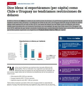 El último informe de Idesa se centra en las restricciones de divisas y la perfomance general de las economías de nuestros vecinos más cercanos: “La inflación en Chile es de 2,5% y en Uruguay del 8,4% anual. El dólar en ambos países subió apenas 8% en todo el año 2018. Las tasas de interés son tan bajas como la inflación, por eso el crédito para la producción y el consumo funcionan con normalidad.