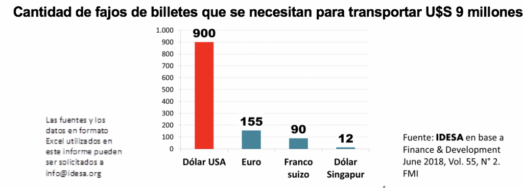 Estos datos muestran que la complejidad en el proceso de transporte y ocultamiento de dinero en efectivo depende de la moneda que se use. El billete de mayor denominación en euros es de 500, en francos suizos de 1.000 y en dólares de Singapur de 10.000. Si se hubieran usados algunas de estas monedas muchos hechos de corrupción no se habrían descubierto. Los bolsos, los cuadernos y las bóvedas no hubiesen sido necesarios o hubieran tenido un protagonismo mucho menor. Afortunadamente estas monedas son más fáciles de esconder pero más difíciles de usar porque cuentan con menos liquidez. Esto seguramente es lo que indujo a los implicados a optar por los dólares americanos.