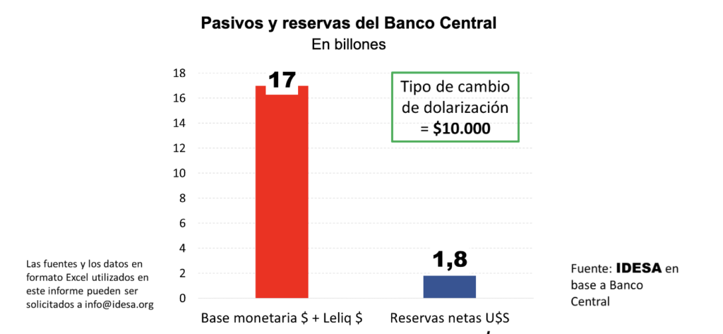 Estos datos muestran que si el Banco Central quisiera rescatar todos los pesos emitidos y entregar dólares a cambio lo debería hacer con una mega devaluación. Si se reforzaran las reservas, por ejemplo, con algún crédito internacional que contrajera el Estado argentino, el valor de rescate se podría reducir. Pero las probabilidades de que esto ocurra, en las magnitudes necesarias para evitar una gran devaluación, son remotas. Hay que resignarse a asumir que para dolarizar se necesita un salto devaluatorio muy traumático. Esto es consecuencia de la acumulación de recurrentes emisiones monetarias en el pasado destinadas a cubrir crónicos déficits fiscales.