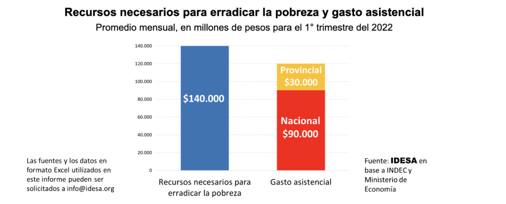 Para dimensionar el esfuerzo que el Estado argentino hace en planes asistenciales se puede comparar lo que se necesitaría para terminar con la pobreza de ingresos con lo que el Estado gasta en planes asistenciales. Procesando datos del INDEC y el Ministerio de Economía referidos al 1° trimestre del 2022 se observa que: