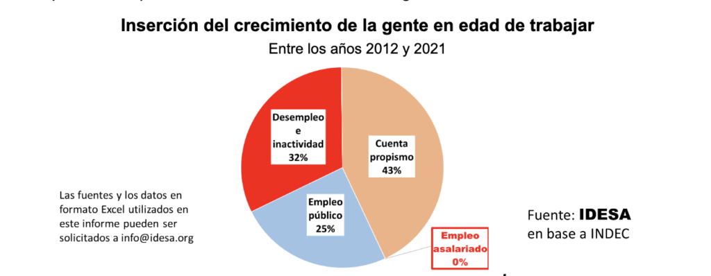 ¿Por qué fracasa una política que goza de tan alto consenso? Para responder esta pregunta resulta pertinente evaluar la dinámica del mercado de trabajo. Según el INDEC, entre los años 2012 y 2021 la población en edad de trabajar creció en aproximadamente 3 millones de personas, las cuales laboralmente se insertaron de la siguiente manera: