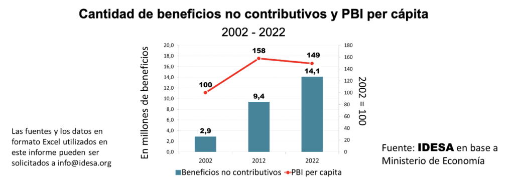 Estos datos muestran la impresionante expansión de los beneficios no contributivos. El proceso se dio con crecimiento económico (entre los años 2002 y 2012, el PBI per cápita aumentó un 58%), pero también con estancamiento (entre los años 2012 y el 2022 el PBI per cápita se contrajo un -5%). Lo cierto es que, desde la crisis del 2002, los beneficios no contributivos prácticamente se quintuplicaron. Llama la atención que la expansión se dio con la economía en crecimiento y en contracción y con diferentes gobiernos. Sugiere que se trata de otra “política de Estado” no explícita, pero ampliamente compartida.