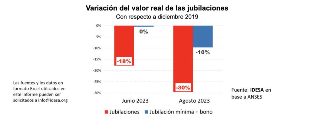 - Asumiendo que la inflación se mantiene en 8% mensual, en agosto del 2023 las jubilaciones serán un 30% inferior y la mínima un 10% inferior a diciembre del 2019.