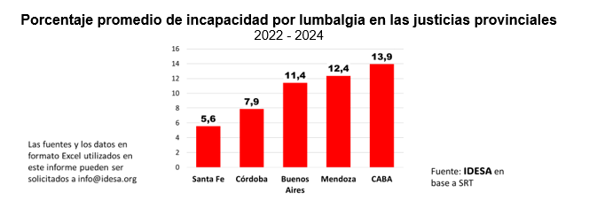 Una de las dolencias más reclamadas es la lumbalgia (dolor de espalda). Las Comisiones Médicas nacionales, aplicando una lógica análoga a la Corte, consideran que no corresponde indemnización cuando no genera incapacidad. Pero analizando los fallos emitidos por las justicias provinciales para esta dolencia entre el 2022 y el 2024 se observa que en promedio: