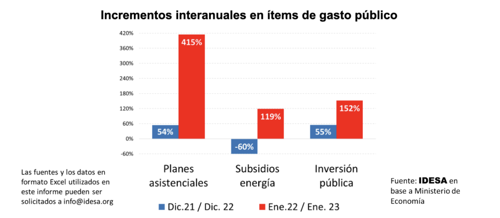 Estos datos muestran que una de las estrategias que uso el gobierno para ajustar las cuentas públicas y cumplir con las metas del FMI en el 2022 fue posponer pagos. Como el FMI monitorea la contabilidad de caja, al diferir pagos el déficit fiscal se reduce en la misma magnitud. Demorar pagos, especialmente en un contexto de alta inflación, provoca perturbaciones, costos ocultos y no es sostenible de manera indefinida. El salto en los gastos en enero es una evidencia en tal sentido.
