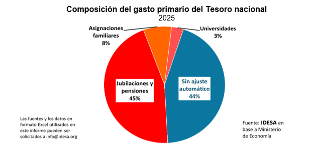 - El 45% del gasto primario corresponde a jubilaciones y pensiones que, por la regla de movilidad, se ajustan automáticamente por inflación.