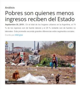 En el total de los hogares urbanos en la Argentina, el 74 % de los ingresos son de fuente laboral y el 26 % restante son de fuentes no laborales. Este promedio esconde grandes diferencias entre segmentos sociales.