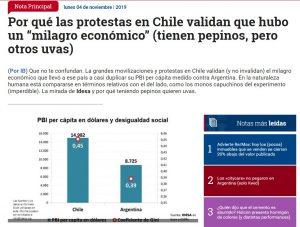 (Por IB) Que no te confundan. La grandes movilizaciones y protestas en Chile validan (y no invalidan) el milagro económico que llevó a ese país a casi duplicar su PBI per cápita medido contra Argentina. En la naturaleza humana está compararse en términos relativos con el del lado, como los monos capuchinos del experimento (imperdible). La mirada de Idesa y por qué teniendo pepinos quieren uvas