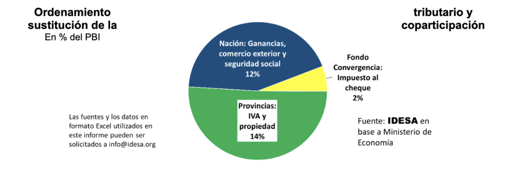 Actualmente la presión tributaria nacional y provincial es de 28% del PBI. Un 14% del PBI son impuestos que se coparticipan en mitades (7% para la Nación y 7% para las provincias). La Nación se queda con 16% del PBI porque, al 7% de la coparticipación, agrega 9% del PBI con impuestos al comercio exterior, seguridad social y cheque. Las provincias se quedan con 12% del PBI, porque a su 7% de la coparticipación le suman los impuestos provinciales. Este esquema le permite a la Nación gastar en funciones locales a través de transferencias a provincias (1,5% del PBI) y en subsidios a energía y transporte (2,5% del PBI).