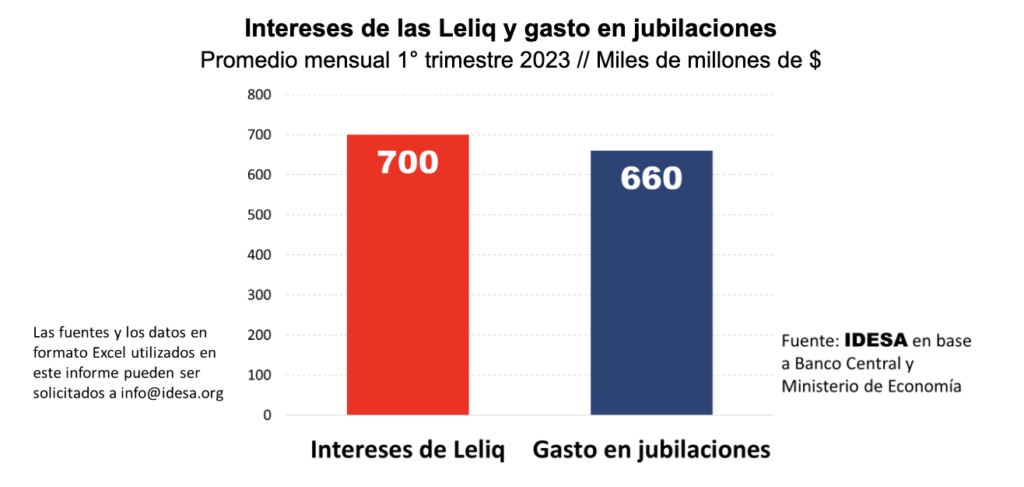 Una manera de dimensionar el problema es comparar los intereses que devengan las Leliq con el pago de jubilaciones, principal gasto que tiene el Estado nacional. Según datos del Banco Central y del Ministerio de Economía, en el 1° trimestre del 2023 se observa que: