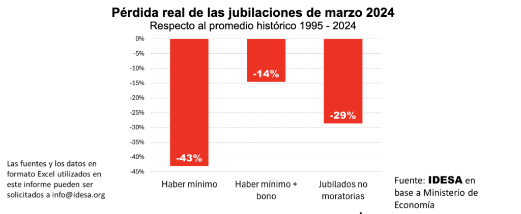 Para evaluar la importancia y urgencia de revisar la normativa previsional sirve comparar los haberes actuales respecto al promedio de las últimas tres décadas. Según información oficial, y suponiendo inflación del 15% y 10% para febrero y marzo respectivamente, se observa que en marzo 2024: