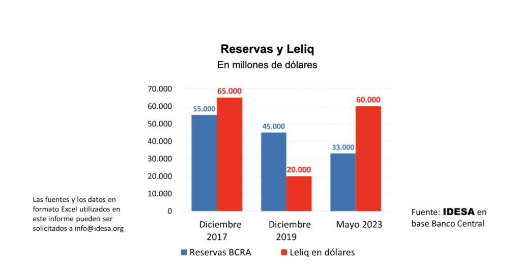 - En mayo del 2023 las reservas son de USD 33 mil millones y las Leliq medidas en dólares volvieron a ascender a USD 60 mil millones.